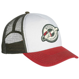 Цвет кремовый белый, козырек красный, сетка темно-зеленая, 100 % полиэстер, накладная эмблема «STIHL Chainsaw » в круге.