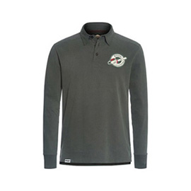 Цвет темно-зеленый, 100 % хлопок, однослойное джерси, длинные рукава, воротник на кнопках, вышитый мотив бензопила в круге с надписью «STIHL Chainsaw » на груди слева.