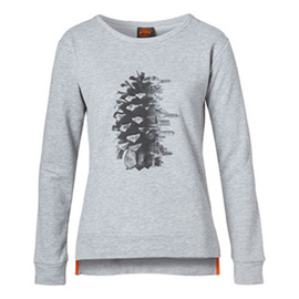 Цвет серый, 65 % хлопок, 35 % полиэстер, на груди фото-принт с мотивом «шишка», свободный покрой, боковые разрезы, спинка длиннее полочки.