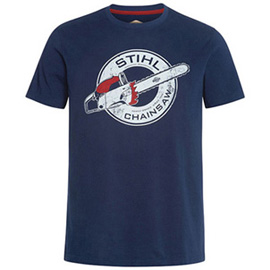 Цвет темно-синий, 100 % хлопок, однослойное джерси, на груди принт с бензопилой в круге и надписью «STIHL Chainsaw».