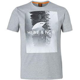 Цвет серый, 50 % хлопок, 50 % полиэстер, на груди принт «HERE & NOW», оранжевая тесьма на внутренней части воротника.